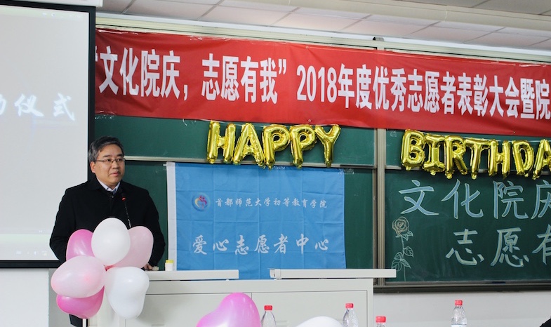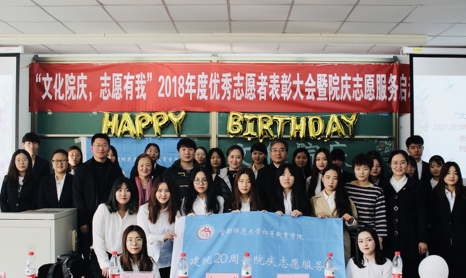 2019年3月28日,初等教育学院院庆特别活动——“文化院庆,志愿有我” 2018志愿服务表彰大会暨爱心志愿者中心成立五周年庆典—院庆志愿服务启动仪式在东区教室C210成功举办。党委书记张润杰、院长刘慧、北京自然博物馆实践基地负责人李莉、中国儿童中心剧院实践基地负责人杨博、团委书记崔坤杰、团委副书记丁峰(学生)、团委办公室助理潘嘉怡(学生)与100余名志愿者一起参加了活动。