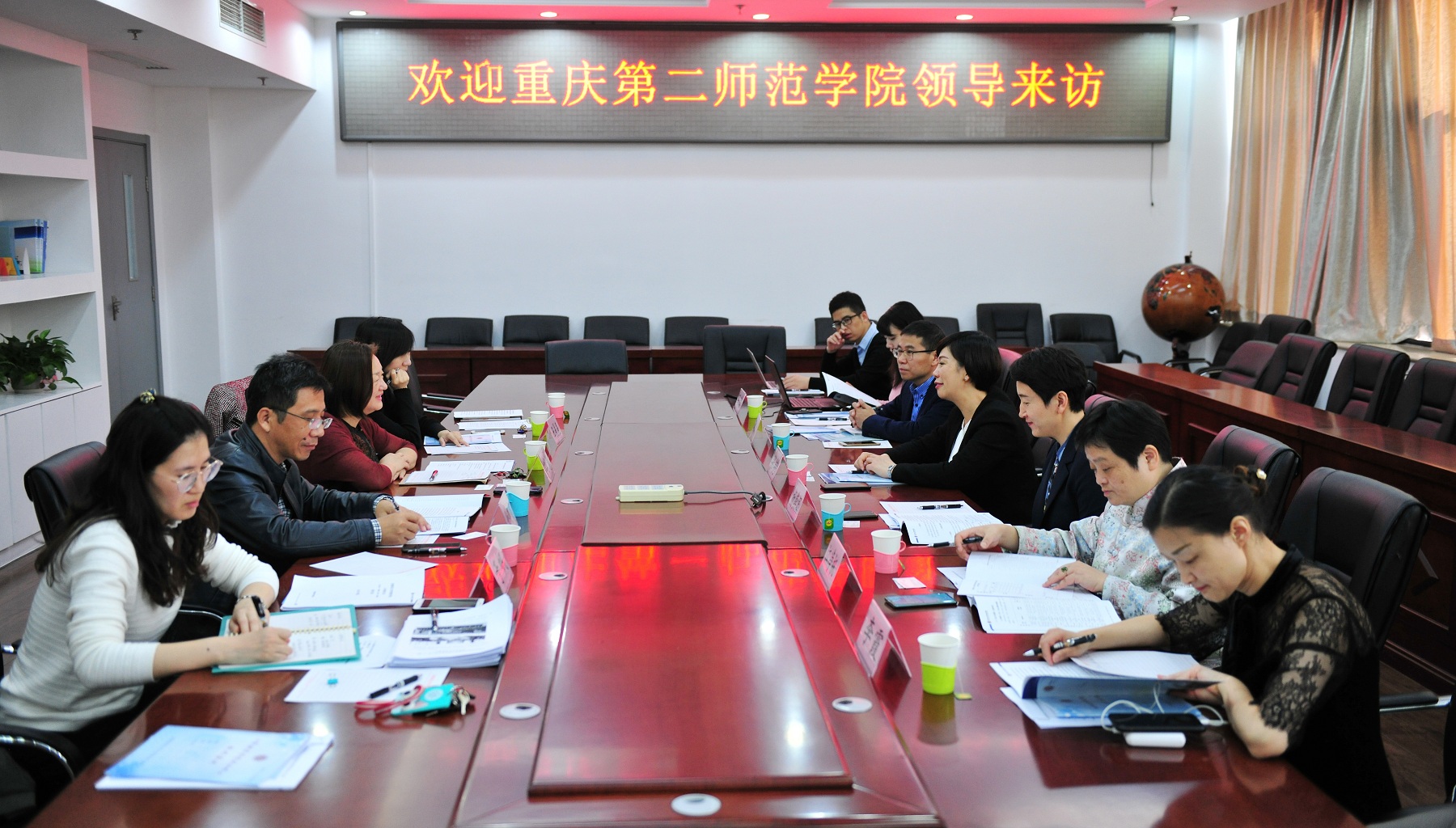 缪劲翔副书记对重庆第二师范学院一行表示热烈欢迎,并介绍了学校近年来的发展、建设情况。刘慧院长介绍了初等教育学院历史沿革、人才培养、办学定位、专业建设、学科建设、师资队伍等基本情况,孙建龙副院长分享了初等教育学院在师范专业认证工作过程中积累的经验及本科人才培养相关工作情况。科研与研究生管理办公室王辰辰老师介绍了研究生招生及培养相关工作。