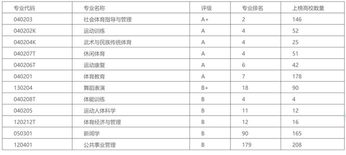 2021年6月22日,高等教育评价专业机构软科正式发布2021“软科中国大学专业排名”。我校12个本科专业全部上榜,其中A+一个,A五个,B+1个,B五个。体育旅游为2020年新增设专业,排名中未涉及。电子竞技运动与管理专业2021年开始招生,未参与排名。