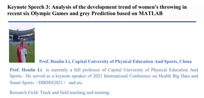 2022年体育科学、教育与社会发展国际学术会议(SSESD2022) 于7月15日至17日在中国昆明隆重举行。会议主要围绕体育科学、教育与社会发展等研究领域展开讨论。旨在为从事 体育科学、教育与社会发展研究的专家学者、工程技术人员、技术研发人员提供一个共享科研 成果和前沿技术,了解学术发展趋势,拓宽研究思路,加强学术研究和探讨,促进学术成果产 业化合作的平台。大会诚邀国内外高校、 科研机构专家、学者,企业界人士及其他相关人员 参会交流。田径团队支部书记李厚林教授受邀以Keynote Speech 3: Prof. Houlin Li, Capital University of Physical Education And Sports, China进行主题报告交流。