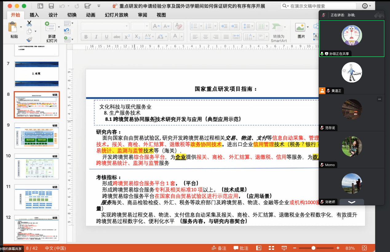此次讲座内容主要围绕重点研发项目申请经验分享以及国外访学期间研究的有序开展两个方面展开。在讲座的第一部分,孙老师详细解读了国家科技部重点研发计划的申请流程,并结合他们在申请“文化科技与现代服务业”重点专项2022年度项目《跨境贸易协同服务技术研究开发与应用》(批准号:2022YFF0903400)子课题的实际经验,深入分享了破题、组队以及答辩准备的关键步骤和应对策略。这些实用的指南为我校教师在未来申请类似项目时提供了有力的支持。在讲座的第二部分,孙老师分享了他在法国巴黎访学的经历,包括如何应对罢工等突发事件,以及如何在国外留学期间参与项目研究、对接课题各个研究单位、督促相关研究进度、参与会议汇报和指导学生推进研究等方面的经验。这些实用的策略为我校教师在国外进行科研活动提供了宝贵的实践指导。讲座的最后,孙老师还耐心解答了现场教师的疑问,进一步加深了教师们对重点研发项目申请和国外访学研究的理解。