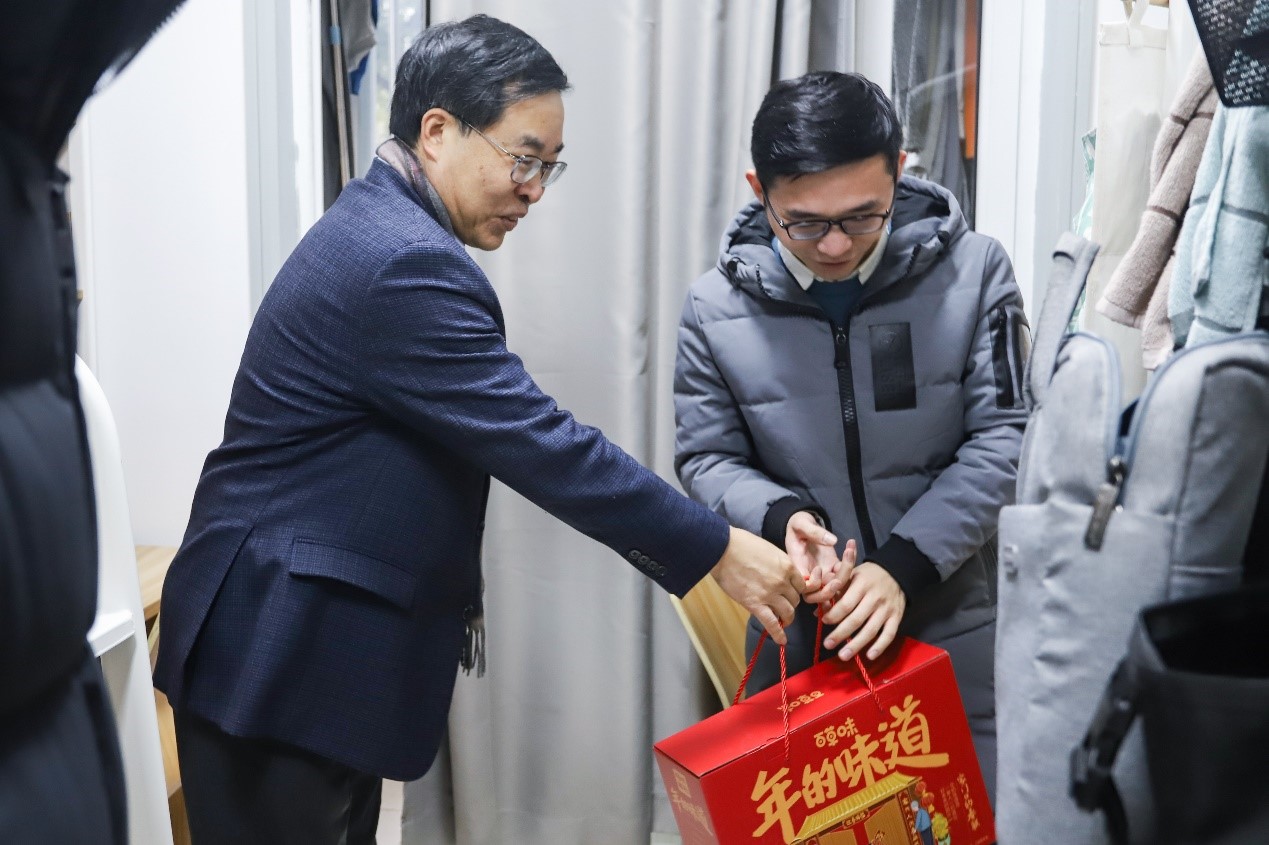 奚立峰一行走访了西42楼栋宿舍,为学生们送去新春佳节大礼包和最温暖的问候。