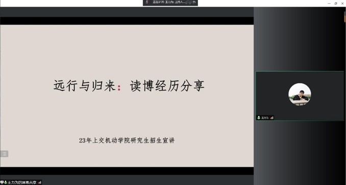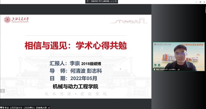 机械与动力工程学院2023年研究生优秀生源选拔与致远荣誉计划夏令营活动已于5月20日正式启动报名,招生微信推送阅读量达7565人次,获得了高度关注。本次招生宣讲会分为腾讯会议主会场和直播同步进行,主会场邀请了来自60余所高校的300余名学子参会,直播平台吸引了200余人次观看。近年来,为适应常态化疫情防控要求,学院结合以往线下实地宣讲和“互联网+”新技术的优势,主动搭建线上宣讲互动平台,连续3年与广大学子“云上赴约”,不让疫情阻断每一位英才“择良机动,砥砺远行”的梦想。欢迎广大学子积极报考上海交大机械与动力工程学院。