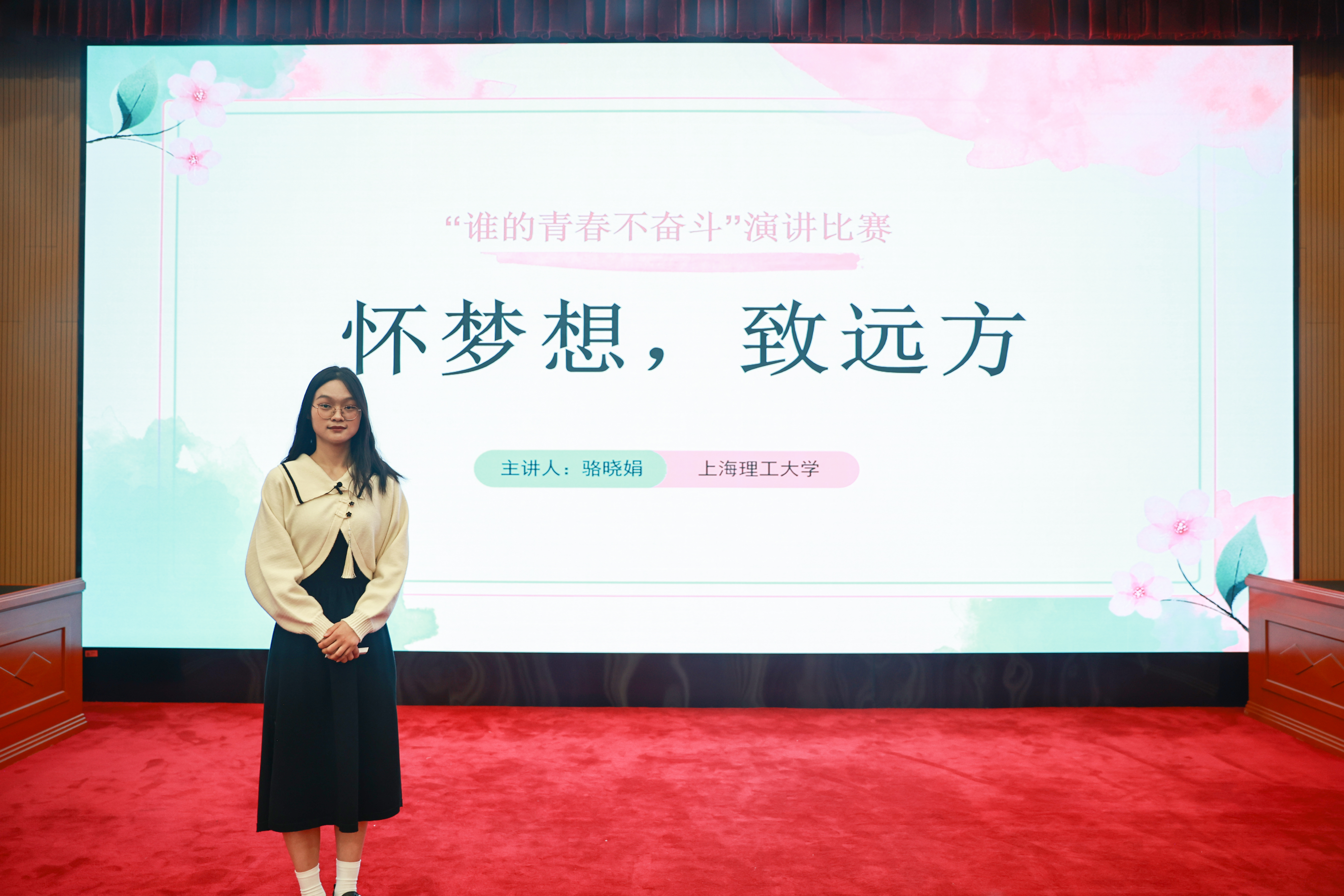 外语学院的骆晓娟同学以《怀梦想·致远方》为题,展示了自己在克服困难,乐观昂扬的精神品格,特别结合自己的进博会志愿者服务活动经历,描绘了在学习实践中熠熠生辉的奋斗历程。
