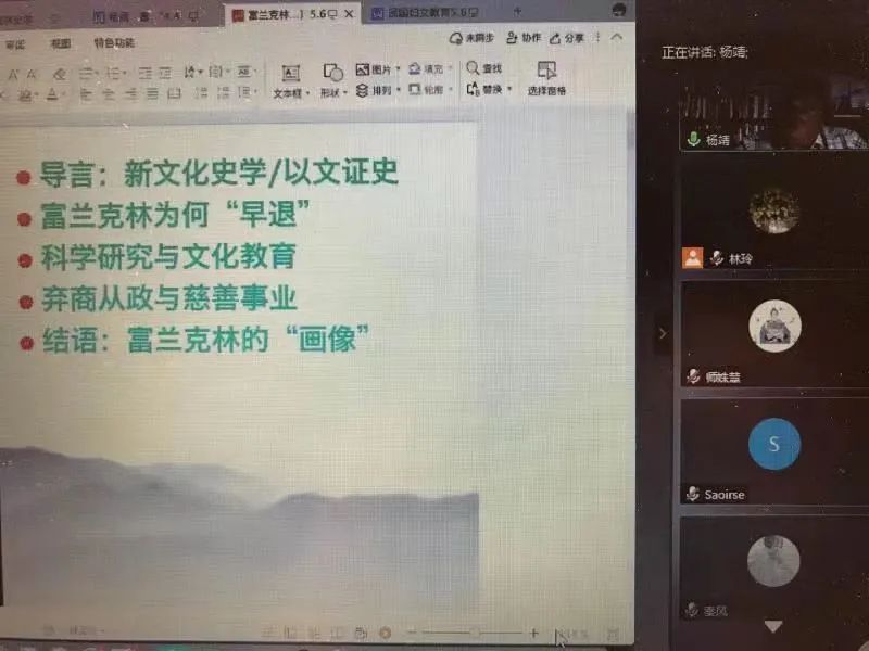5月6日晚,英语学院美国研究中心邀请了南京师范大学外国语学院美国文明研究所所长杨靖教授做客“博雅论坛”,举行题为《富兰克林在1784--兼论文史的畛域与融通》的线上讲座,讲座由美国研究中心执行主任林玲教授主持,来自上外以及外校的60余名师生参加了本次讲座。