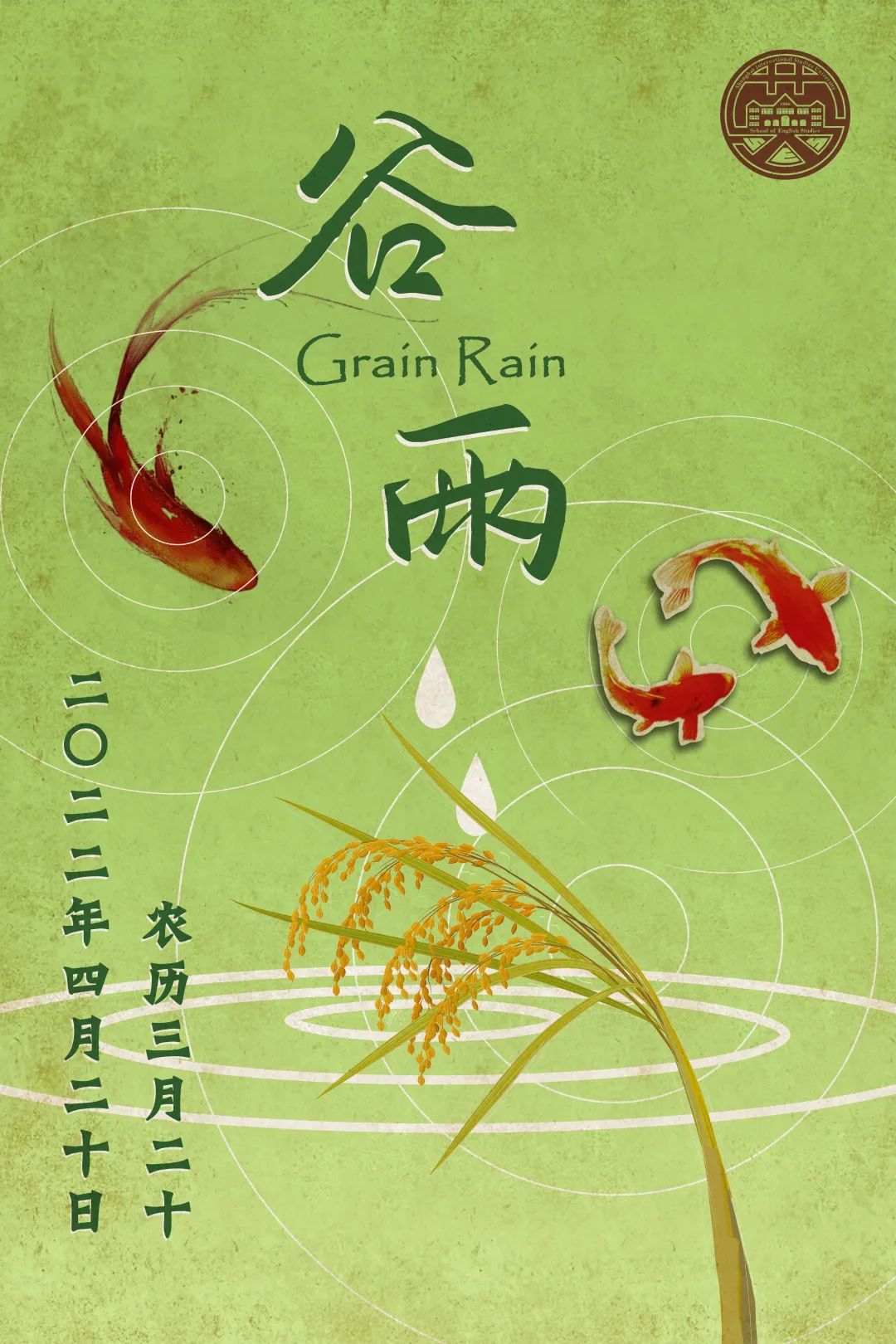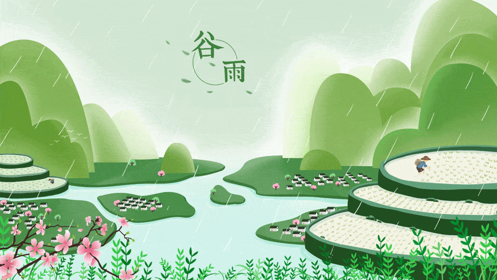 “晓天谷雨晴时,翠罗护日轻烟里。酴(tú)醿(mí)(good wine)径暖,柳花风淡,千葩浓丽。”谷雨,是二十四节气中的第6个节气,也是春季最后一个节气。每年4月19日至21日,太阳到达黄经30°时,即为谷雨。谷雨取自“雨生百谷”之意,此时降水明显增加,田中的秧苗初插、作物新种,正是最需要雨水滋润之时。谷雨时节降雨量充足且及时,因而谷类作物最能茁壮成长。