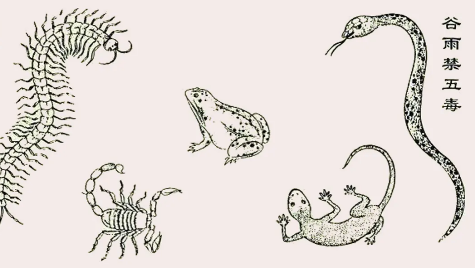 谷雨贴,属于年画的一种,上面刻绘神鸡捉蝎、天师除五毒形象,寄托人们查杀害虫、盼望丰收、安宁的心理。谷雨以后气温升高,病虫害进入高繁衍期,为了减轻病虫害对作物及人的伤害,农家一边进田灭虫,一边张贴谷雨贴,驱凶纳吉。(After Grain Rain, temperature rises and pests proliferate quickly. In order to reduce the damage of pests towards crops and people, farmers fight pests at the same time put up the pictures, wishing for good harvest and fortune. )
