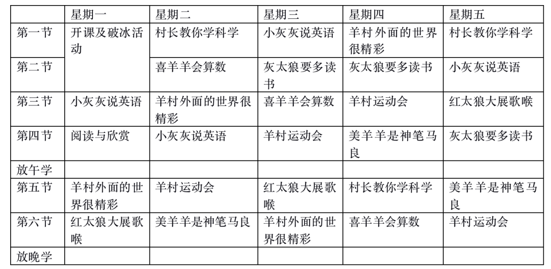 除此之外,我们也很用心地为学生们进行教材设计及备课。下面的表格是我们为学生一周设计的课程。我们通过新颖的方式,以动画角色为主题,开展语文、数学、英语、阅读、体育、音乐等等不同课程的教授。我们希望能够用有趣生动的课程帮助当地的小学生们培养学习的兴趣,也能够帮助他们更好地了解外面的世界。我们希望能够在学生们心里种下一颗求学的种子!