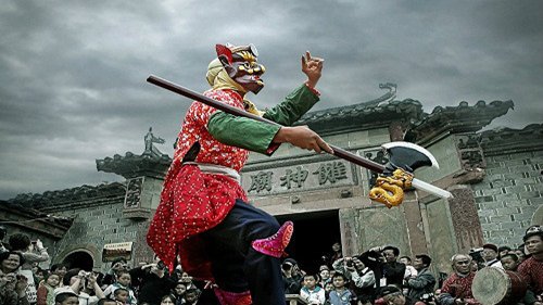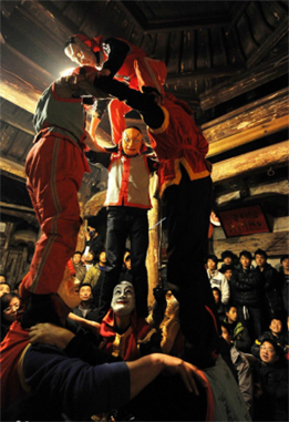农民艺人每年春节“起傩”,走村串户演傩舞,祝福纳吉。(Rural artists initiate “Qi Nuo” (the open ceremony) in each Spring Festival. They perform the Nuo dance among villages and households, praying for good fortune in the new year.)