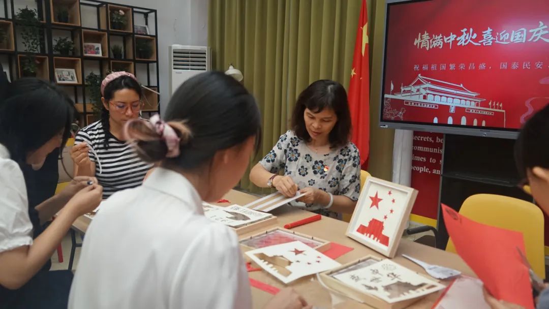 主题交流后,“月升华诞”工作坊活动开始。花好月圆、盈月入怀、皓月千里、国泰民安……一把把剪刀,剪出了中秋的文化底蕴和真挚祝愿;南湖红船、星火燎原、五星照耀、盛世中华……一双双巧手,点缀着祖国的峥嵘岁月和美好画卷。“这些图样设计精美、又红又专,激荡着我内心澎湃的爱国情怀!”“我仿佛从这些竹编中看到了中国共产党一路走来的岁月长河!”金秋十月,师生共享佳节团聚,同诉爱国衷情。