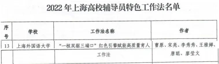 | 我院学生工作组获评2022年上海高校辅导员特色工作法 - 上海外国语大学英语学院三全育人综合改革试点院(系) - 思政网育人号 - 全国高校思想政治工作网