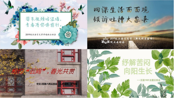 针对居家学习期间产生的负面情绪如何调控的问题,各班班委也“各有妙招”。汉语言文学卓越教师实验班向同学们普及了心理健康知识,帮助同学们保持积极乐观的心态。汉语言文学1班以“纾解苦闷,向阳生长”为主题,针对疫情期间出现的网课焦虑、如何正确处理家庭关系等方面展开讨论交流,在畅谈中纾解苦闷,保护心灵的净土。汉语言文学4班以“樱花之季,我奔向你”为主题,通过观看疫情相关短视频,感知疫情中的温暖,传递正能量。