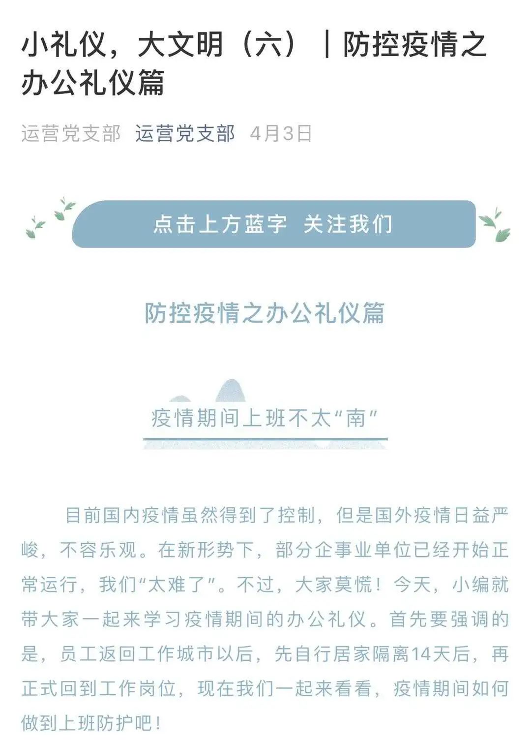 4月3日,运营党支部在微信平台上推出防控疫情之办公礼仪。随着国内疫情得到良好控制,各企事业单位工作逐步走上正轨,员工也回到工作城市和工作岗位。但国内疫情未解除,国外疫情日益严峻,在新形势下办公既要做好相应防护,又要不失礼仪。