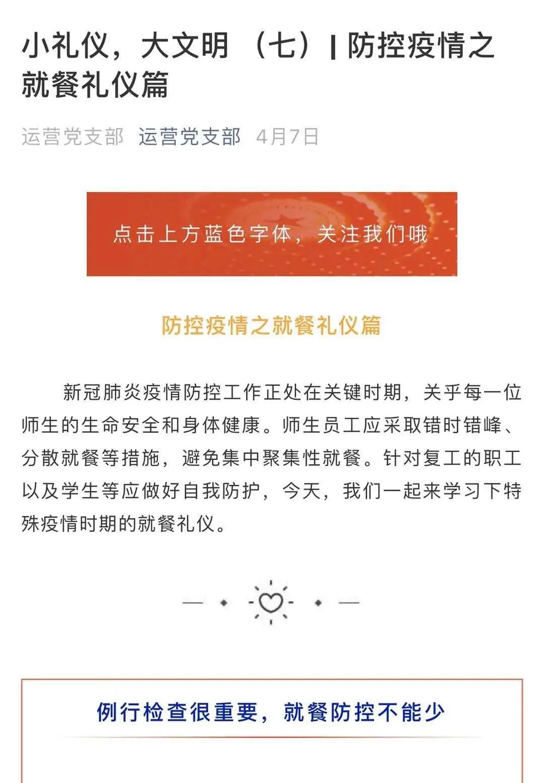 4月7日,运营党支部在微信平台上推出防控疫情之就餐礼仪。新冠肺炎疫情防控工作正处在关键时期,关乎每一位师生的生命安全和身体健康。师生员工应采取错时错峰、分散就餐等措施,避免集中聚集性就餐。文章针对复工职工以及复学学生就餐时如何做好防护并不失礼仪进行了介绍。