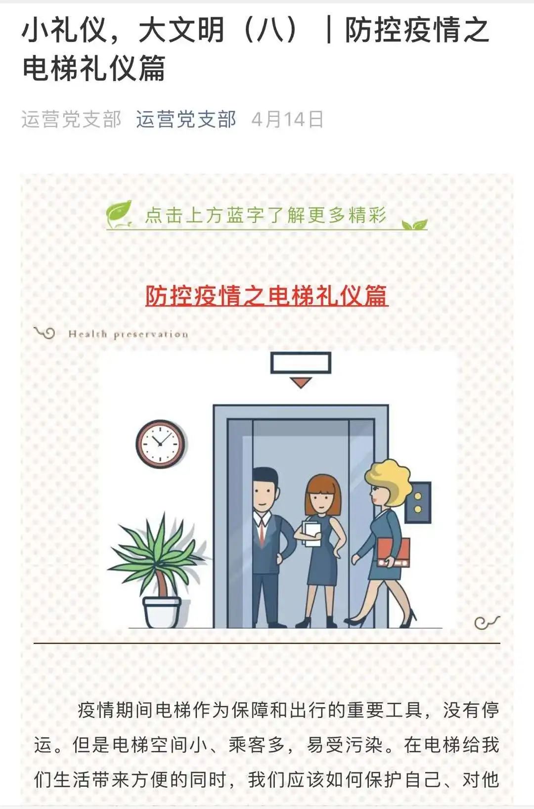4月14日,运营党支部在微信平台上推出防控疫情之电梯礼仪。疫情期间电梯作为保障和出行的重要工具,没有停运。但是电梯空间小、乘客多,易受污染。在电梯给我们生活带来方便的同时,也增加了与他人接触的机会。文章介绍了安全有序地乘坐电梯的方法,保护自己,也对他人负责。