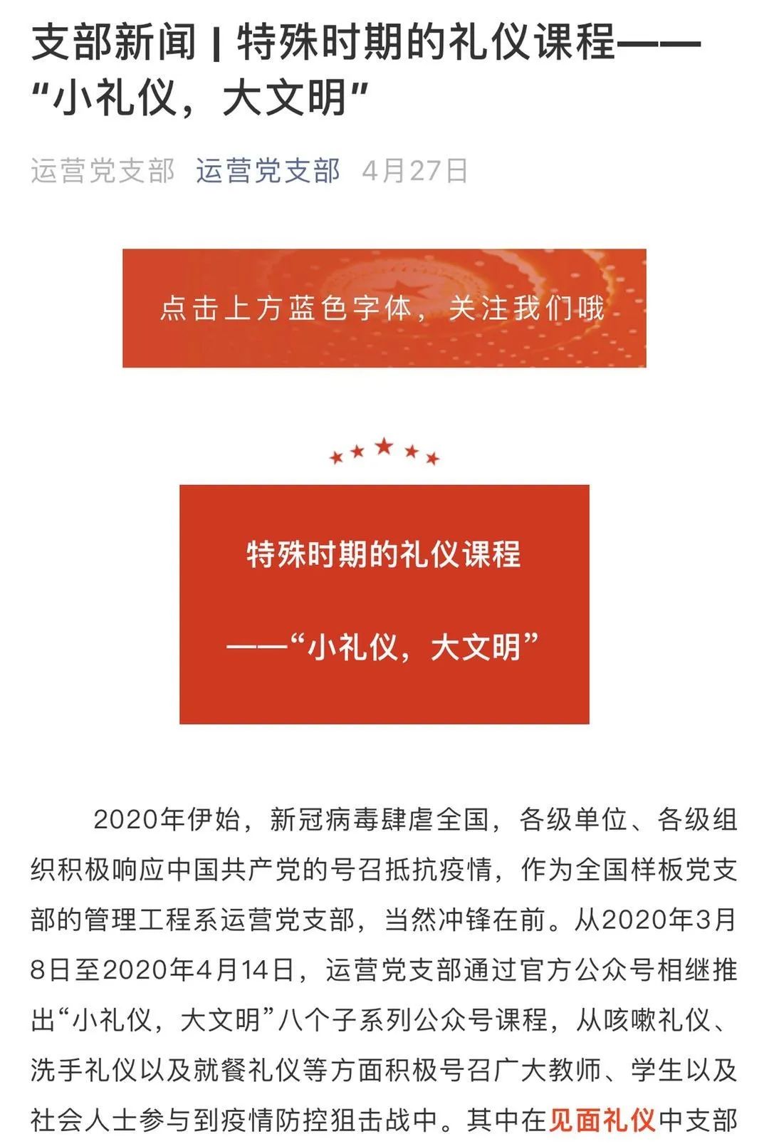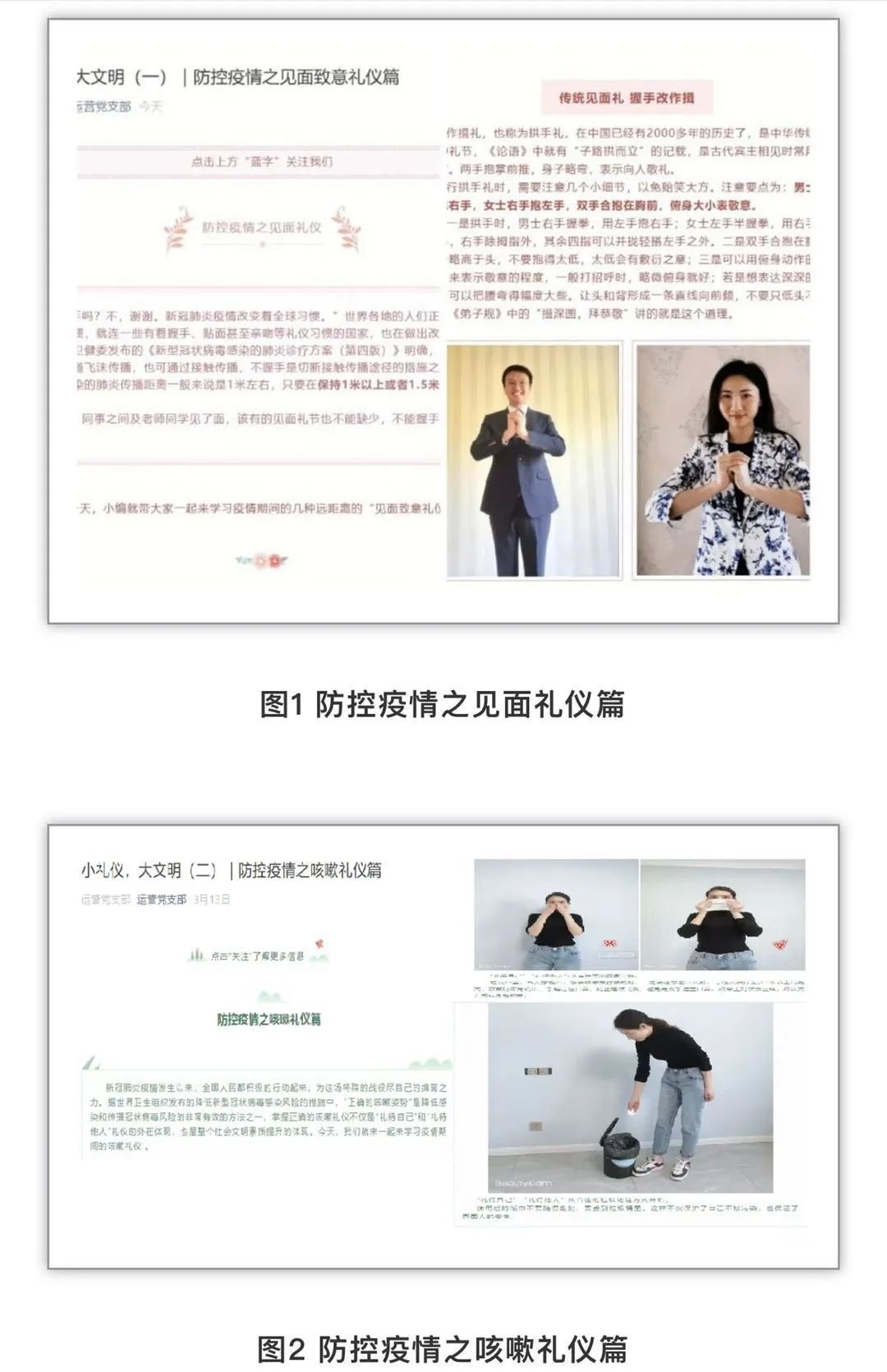 4月27日,运营党支部在微信平台和国家样板党支部平台上推出疫情期间礼仪课程总结,再次强调各类礼仪的作用。“疫情就是命令,防控就是责任”,一个支部就是一个战斗堡垒,在防控工作中,运营党支部采用公众号宣传的模式,为广大师生以及社会人士宣传疫情期间的礼仪知识,号召广大社会人士以及师生通过学习疫情防护礼仪知识,了解相关疫情要点。从最基本的礼仪入手,切断疫情传播途径,有效助力疫情防护工作。