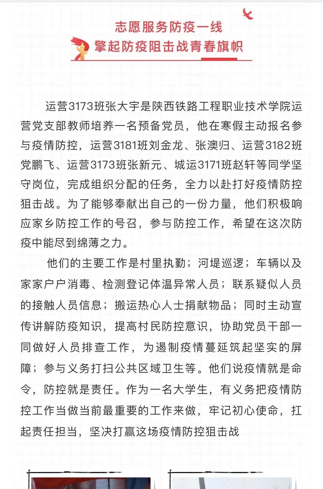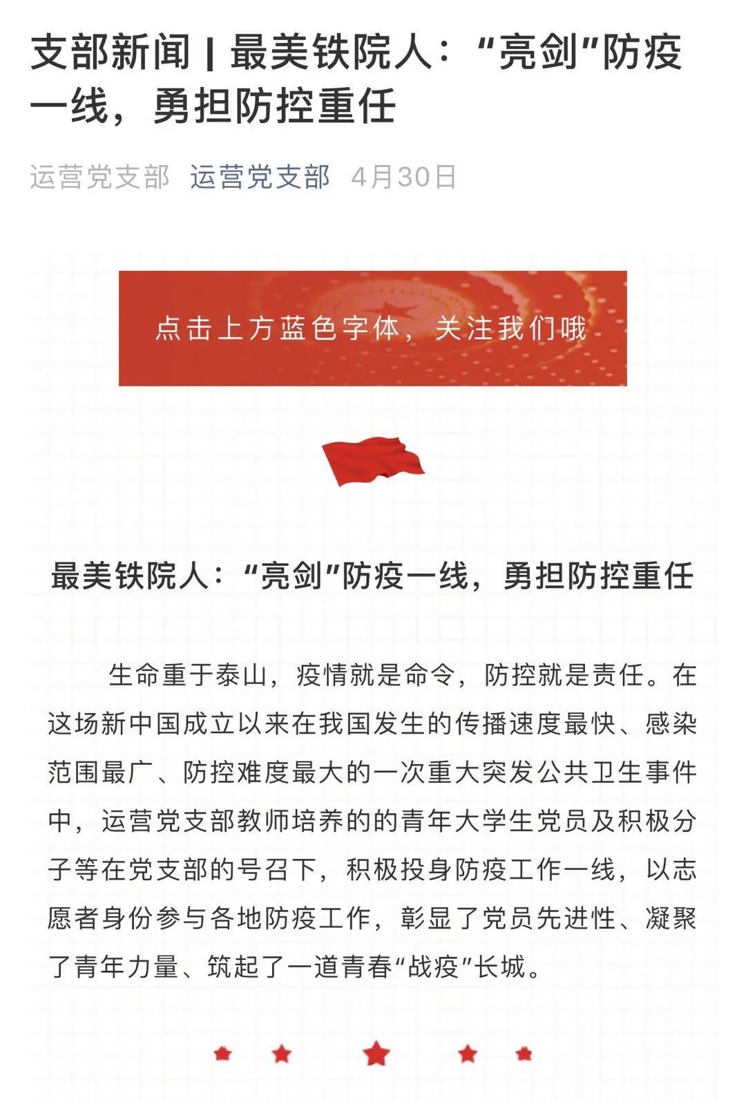 运营党支部在微信平台和国家样板党支部平台上推出文章最美铁院人:“亮剑”防疫一线,勇担防控重任。文章介绍了运营党支部为保证青年大学生志愿者们自身安全,提高志愿服务质量,通过视频会议、云课堂APP推送等形式,组织志愿者们学习疫情防控知识及注意事项、居家隔离及个人卫生等知识,为志愿者服务工作打下坚实基础;同时介绍了各位青年志愿者奋斗在抗疫一线的情况。