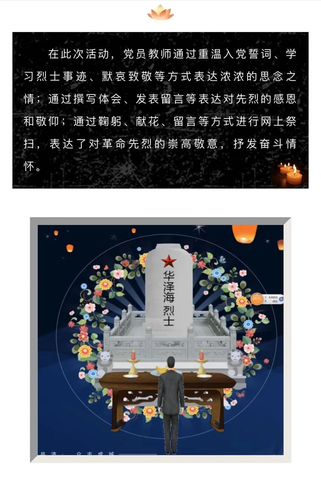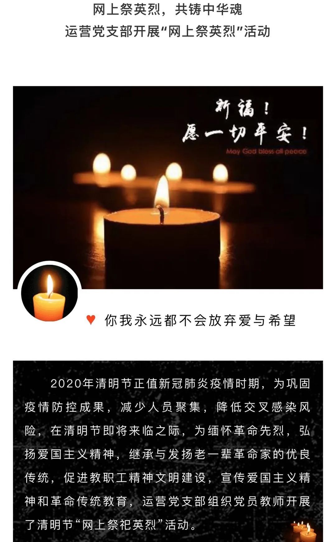 4月3日,在清明节即将来临之际,为缅怀革命先烈,弘扬爱国主义精神,继承与发扬老一辈革命家的优良传统,促进教职工精神文明建设,宣传爱国主义精神和革命传统教育,疫情期间,运营党支部组织党员教师开展了清明节“网上祭祀英烈”活动。