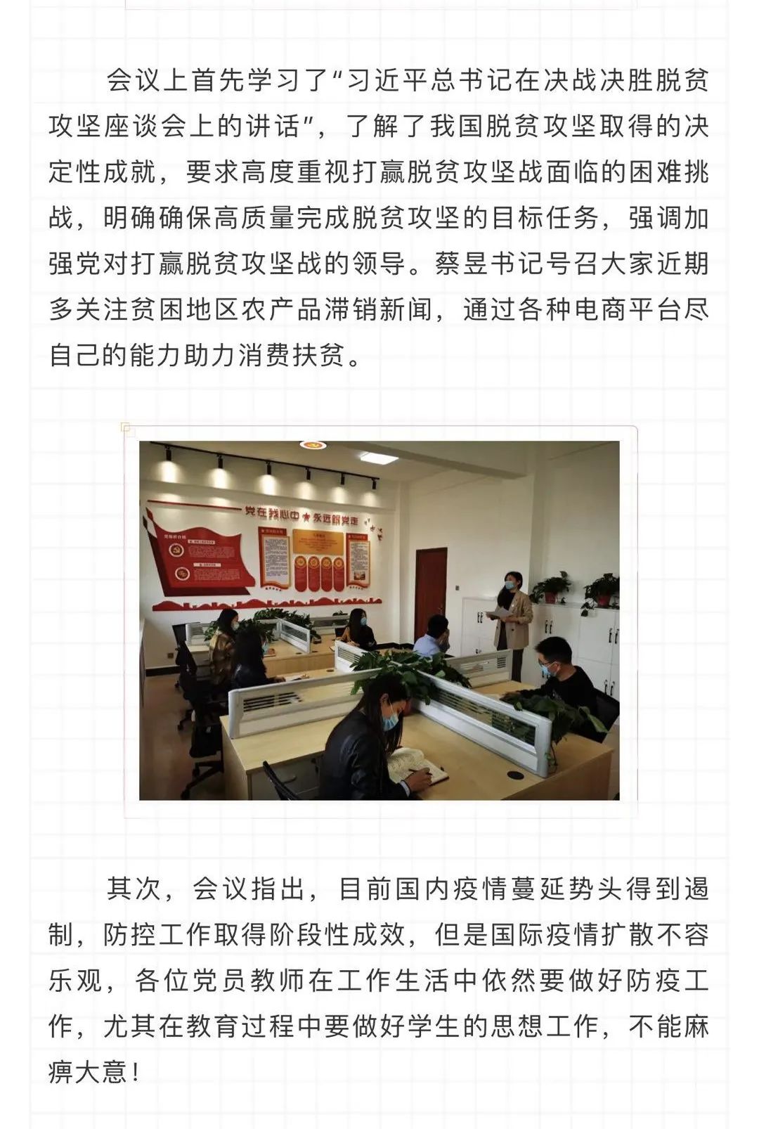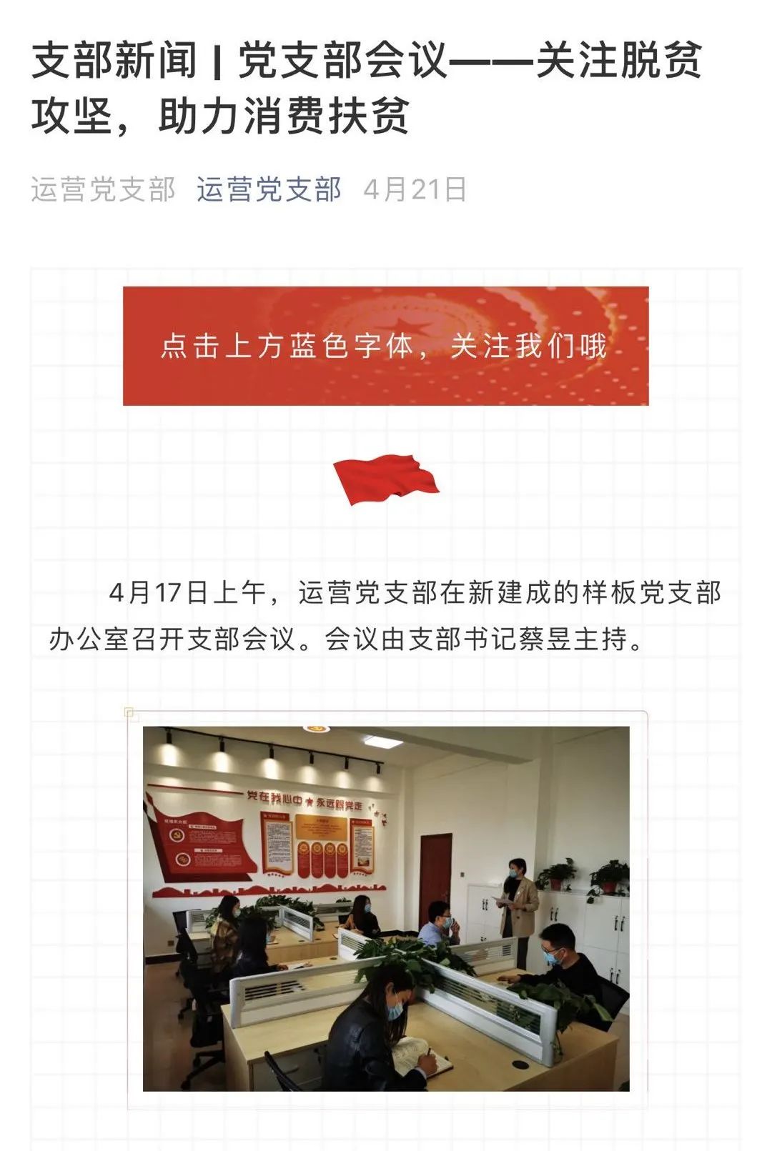 4月17日,运营党支部在新建成的样板党支部办公室召开支部会议。会议同时利用智慧职教平台开展“脱贫攻坚”主题学习,了解了我国脱贫攻坚取得的决定性成就,要求高度重视打赢脱贫攻坚战面临的困难挑战,明确确保高质量完成脱贫攻坚的目标任务,强调加强党对打赢脱贫攻坚战的领导。蔡昱书记号召大家近期多关注贫困地区农产品滞销新闻,通过各种电商平台尽自己的能力助力消费扶贫。