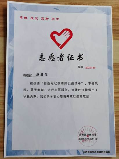 赵君伟同学的志愿服务先进事迹多次被朔州新闻媒体报道。3月13日,我院收到了中共朔州市委、市政府发来的感谢信。赵君伟同学以青春之担当,肩负时代之使命,为战胜疫情而搏击,为美好生活而奋斗,用实际行动彰显了当代大学生甘于奉献的志愿服务精神,展现了新时代大学生的责任担当与青春风采,为我院学生树立了榜样。