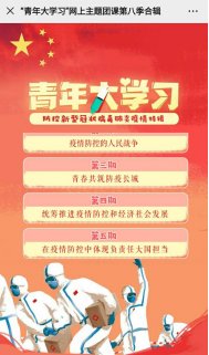 第八季青年大学习以“防控新型冠状病毒肺炎疫情”为主题,每期课程围绕防控防疫内容,讲解了疫情期间的大国担当、人民担当和青年担当。视频的讲解使同学们可以直观的体会到疫情期间国家的有效治理和人民共同抗疫的精神以及青年一代在疫情期间该如何配合国家共同战疫。