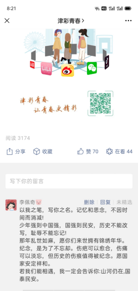 我院师生还积极参与了津彩青春,中华英烈网等线上祭英烈活动。通过读烈士故事,向烈士献花等方式,表达哀思。