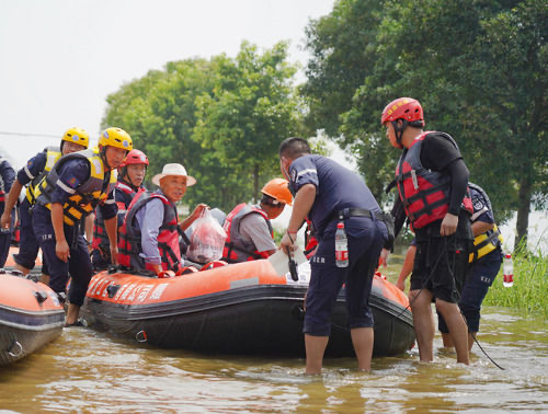 ▼2020年7月9日,在福建南平武夷山市崇安街道石雄社区,消防人员转移被洪水围困群众。