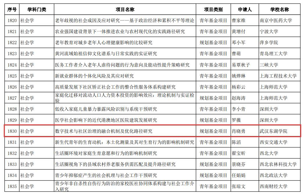 近日,教育部公示了2023年度教育部人文社会科学研究一般项目评审结果,武汉东湖学院经济学院肖晓勇博士申报的《数字技术与社区治理的融合机制及优化路径研究》获得规划基金项目立项。