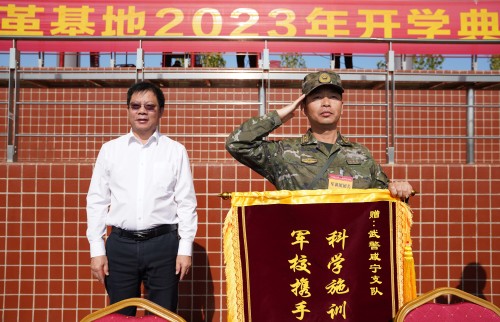 大会最后,校党委书记、省政府教育督导专员湛俊三向武警咸宁支队赠送了锦旗。副校长储鑫带领嘉鱼教学改革基地2023级全体新生齐诵校训。