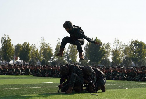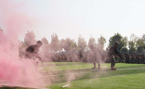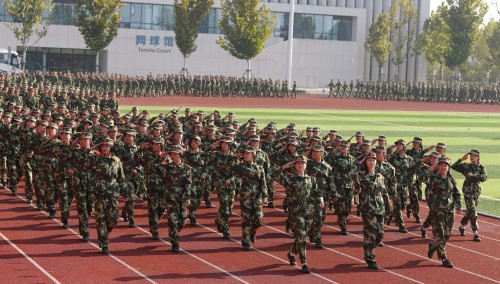 在军训成果汇报展示中,由各学院新生和军训教官组成的方队依次进行分列式、叠被子、擒敌术、战术等军训科目展示,充分展现出东湖学子朝气蓬勃、意气风发的精神风貌。叠被子方队利落敏捷,几分钟便叠出了整齐的“豆腐块”;擒敌术方队英姿飒爽,一招一式气势高昂;战术演练特色方队展示了整齐划一的战术手语、战术持枪姿势和不同形态的战术队形,在“硝烟弥漫”的紧张气氛中激烈搏斗,使人身临其境。