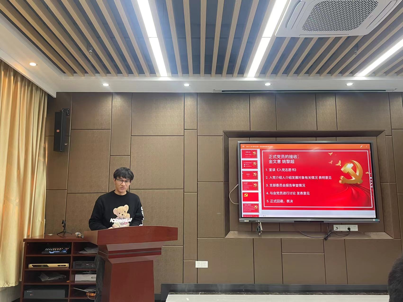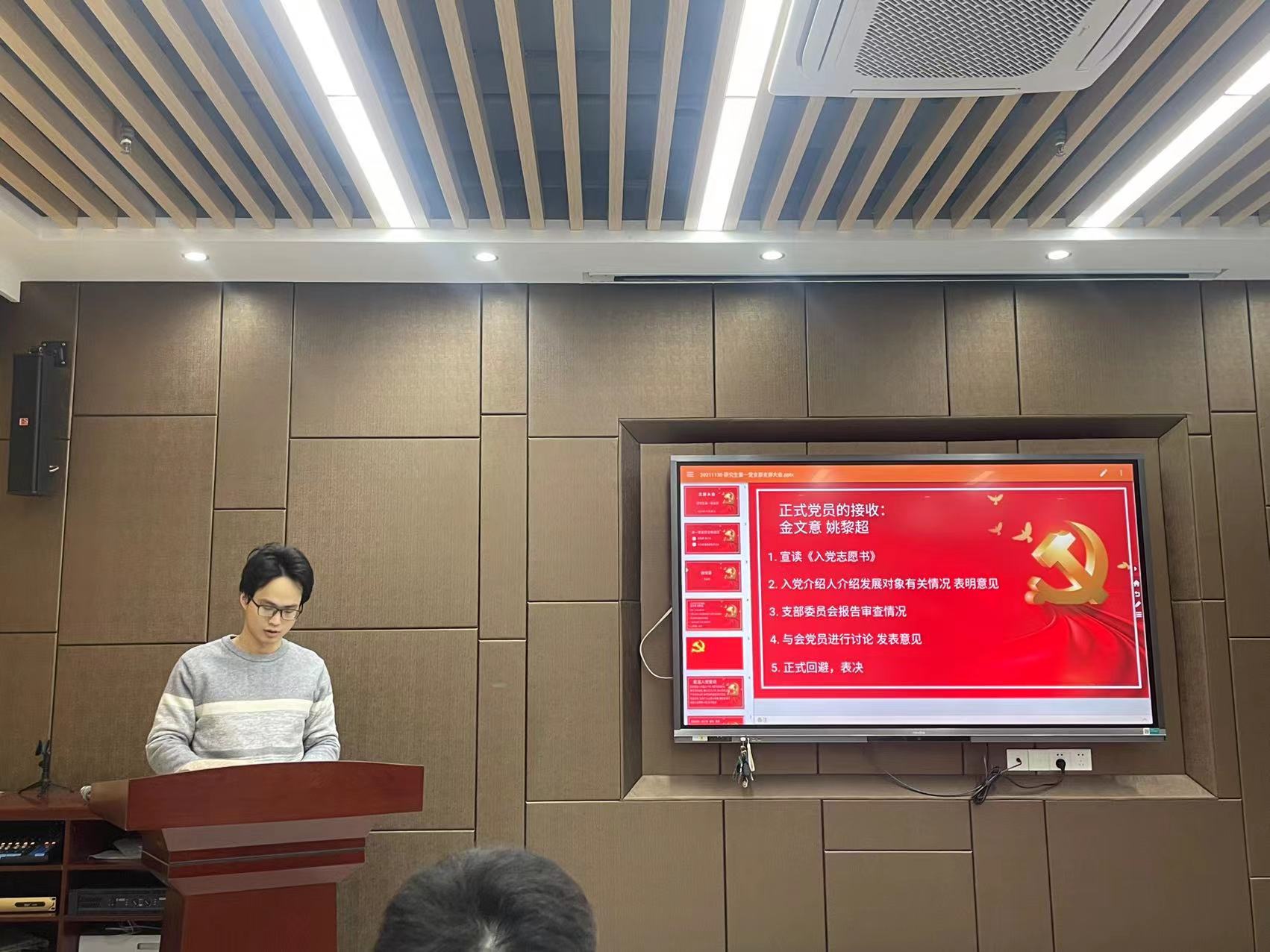 会上,首先,两位同志分别宣读了各自的《入党志愿书》并汇报了自己在预备期间的表现,表明自己的态度和决心;其次,由预备党员的两位入党介绍人介绍预备党员的相关情况,并表明介绍人的意见;随后,支部委员会报告了两位预备党员同志的考察及审查情况,提出能否转为正式党员的意见;最后,在两位预备党员的回避下,与会党员进行了讨论并采取无记名投票的方式进行表决。全体与会党员一致通过金文意、姚黎超两名同志的转正申请,两位同志正式成为中国共产党的一员。