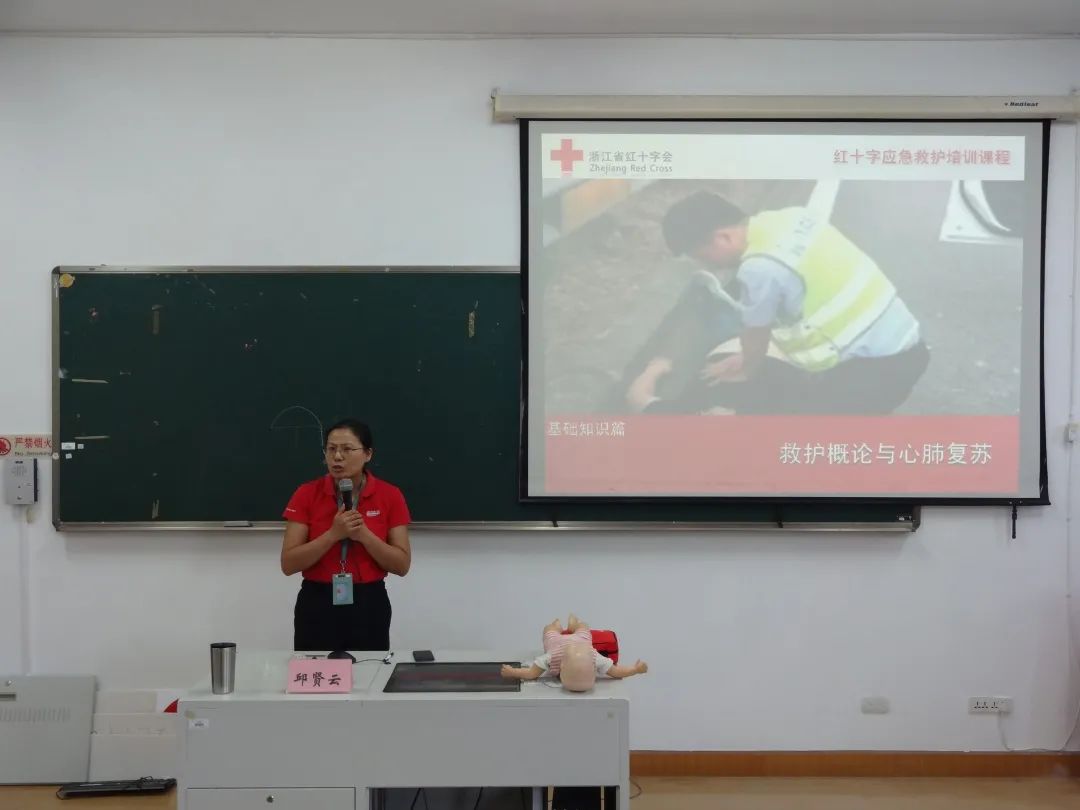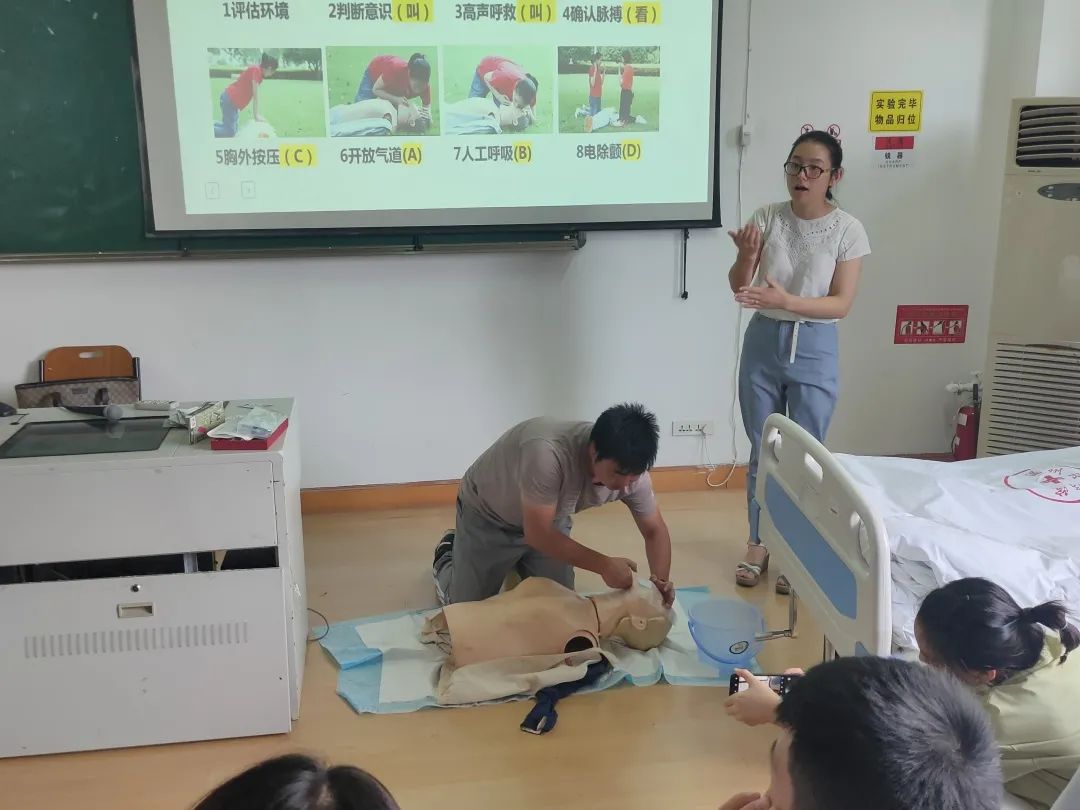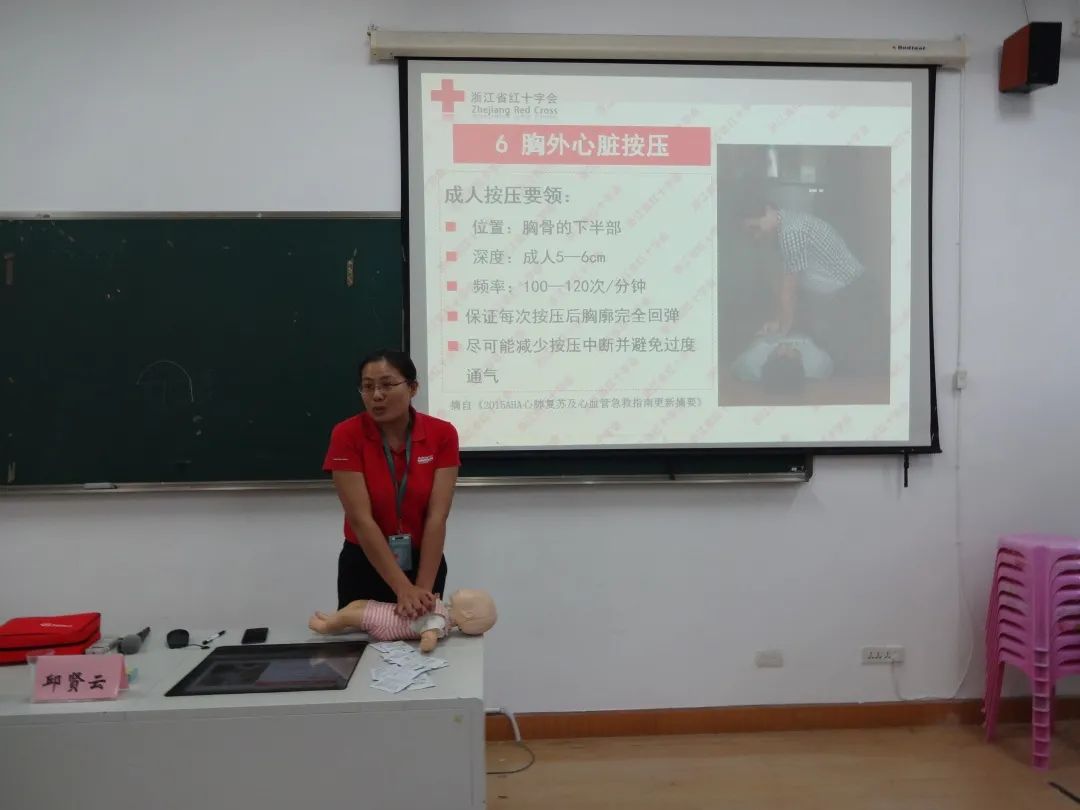 下午两点半,培训课程正式开始。红十字应急救护培训讲师、温州医科大学护理学院教师江思思、邱贤云作为本次活动的主讲人,结合自身多年救护经历,围绕知识点讲述、多媒体播放、操作示范、学员演练等环节,教授全体新任辅导员们心肺复苏、海姆立克急救法等多项急救技能。