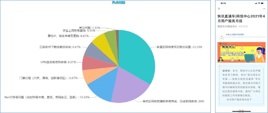 网信服务热线“82667777”全天候接听处办师生报修。服务热线配置呼叫中心语音导航系统,面向全校提供24小时不间断的服务自助办理导引和故障报修人工服务,语音导航全面覆盖学生区、教学区、家属区和留学生基本业务,设置中英双语人工坐席,随时接听处办师生问题咨询和故障报修。目前,服务热线设置11名坐席值班人员,24小时接听处办师生问题,本学期平均每月接听师生来电咨询974起,各类来电问题能够迅速协调解决。此外,自2021年3月起,网信中心通过官方微信公众号每月发布《网信中心用户服务月报》,针对每月服务数据进行梳理分析,确保服务信息及时公开,热点问题及时答疑,不断优化师生服务体验。