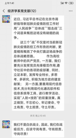 新冠肺炎疫情爆发以来,在西北大学、经济管理学院两级党委的坚强领导和正确指导下,经济学系党支部和系全体教师深入学习《习近平总书记关于疫情防控工作重要讲话、重要指示批示精神汇编》和上级疫情防控工作要求,教育引导全体党员教师在疫情防控工作中进一步增强“四个意识”、坚定“四个自信”、做到“两个维护”。在累计捐款近万元的同时,进一步发挥经济学系党支部战斗堡垒作用,带动全系教师认真完成教学任务、积极探讨线上教学新模式;组织团队、开展科学研究,助力全国和陕西应对疫情、恢复经济。