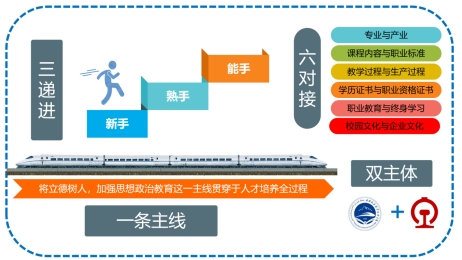 在人才培养过程中,突出党建引领,将党建与教育教学工作紧密结合,把立德树人,加强思想政治教育这一主线贯穿于人才培养全过程。不断深化产教融合,将专业与产业、课程内容与职业标准、教学过程与生产过程、学历证书与职业资格证书、职业教育与终身学习、校园文化与企业文化等六个方面紧密对接,使学生经“生手”“熟手”“能手”三个阶梯逐步提升,最终将学生培养成为“政治坚定、技能过硬、作风优良、纪律严明”的高素质铁路工程专业技术技能人才。