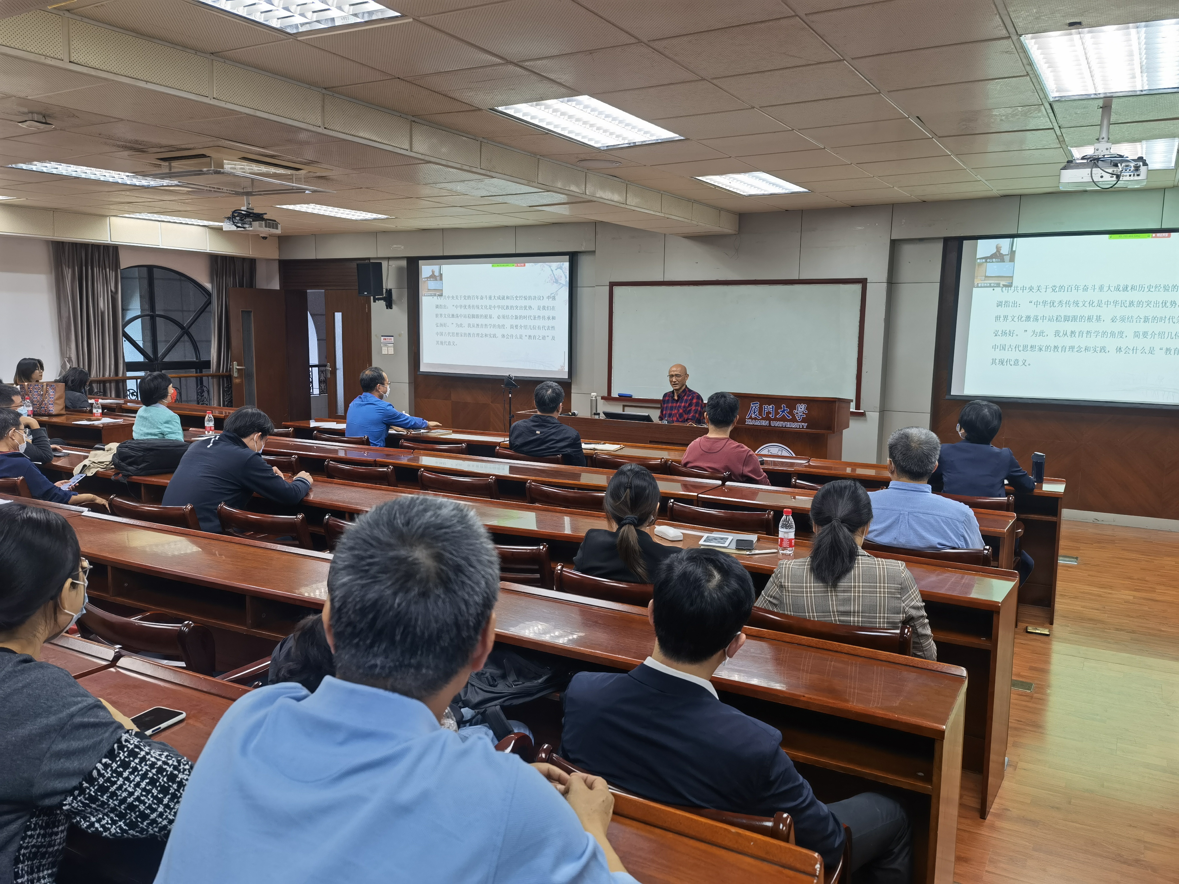 傅小凡以《周易》的自强不息精神开篇,介绍中华教育理念的滥觞,依次介绍孔子、孟子、荀子、老子、庄子、朱子的教育之道,强调了传统文化中关于教育的论述在新时代下仍有重要意义和价值,例如,孔子的 “文在兹乎”说明了教育的目的是传承文化,孟子的“善养吾浩然之气”体现教育事业的终极意义,王阳明的“知行合一”则论述了实践能力的关键性。同时,傅小凡指出教育救国是1840年以后中国人民探索出的新出路,陈嘉庚先生便是这一主张的实践者,宁卖大厦要建厦大兴办教育,以创办南方之强为己任,为人民创造自由幸福的生活。最后,傅小凡强调应谨记自己教书育人的使命,传承和弘扬好中华优秀传统文明,做到止于至善。
