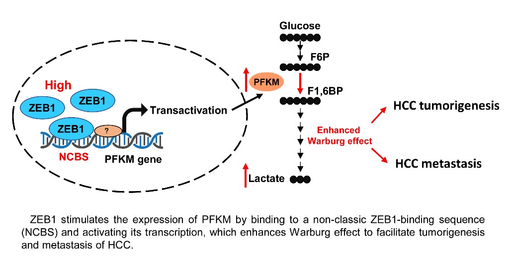 作为转录因子,ZEB1通过结合靶基因启动子上经典的E2-box基序调节基因的表达,在促进上皮间充质转化(EMT)及多种肿瘤的转移过程中起重要作用。在肝细胞癌中,基于EMT的肿瘤转移是导致患者死亡的重要原因之一,因此研究EMT的机理对肝癌的治疗具有十分重要的意义。研究团队发现在高转移性肝癌细胞系中,ZEB1可以促进糖酵解限速酶之一的磷酸果糖激酶PFK1的肌肉型同工酶PFKM的转录表达。有趣的是,尽管在PFKM的启动子区域有经典的E2-box基序,但ZEB1并非通过该基序,而是通过结合非经典的基序促进PFKM的转录。该发现为ZEB1转录调节下游靶基因增添了新的机制。在功能上,ZEB1通过转录激活PFKM增强瓦伯格效应,从而促进肝癌细胞的增殖、迁移、原位成瘤和肝内转移能力。在临床肝癌标本中,ZEB1和PFKM均表达升高,且ZEB1激活PFKM与肝癌患者不良预后密切相关。