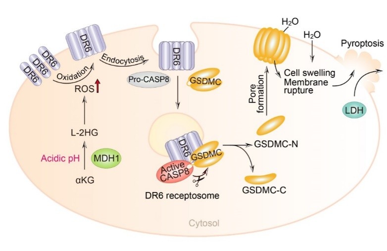 吴乔教授课题组发现,可穿透细胞膜的α-KG,即DM-αKG(dimethyl α-ketoglutarate)有效地诱导肿瘤细胞焦亡。在酸性环境中,α-KG被生理状态下本不会发挥作用的代谢酶MDH1还原为另一种代谢物L-2HG,进而触发细胞中ROS水平升高,诱导细胞膜上的死亡受体DR6(Death Receptor-6)的氧化多聚,进而发生内吞,形成受体小体(receptosomes);内吞的DR6通过衔接蛋白FADD(Fas associated via death domain)的介导招募pro-caspase-8到receptosomes而被激活,与此同时GSDMC也被招募并在receptosomes上被激活的caspase-8切割,最终N端的GSDMC靶向细胞膜打孔,导致细胞发生焦亡。该机制研究展示了一条信号转导的新通路:α-KG-L-2HG-ROS-DR6-Caspase-8-GSDMC。