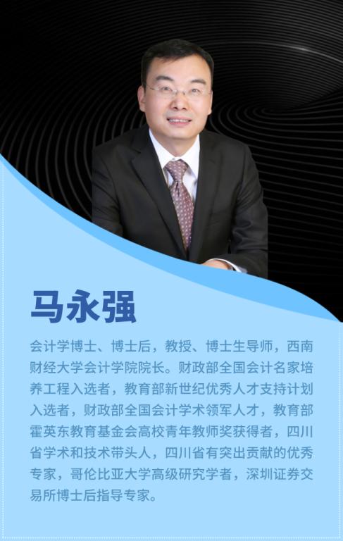 马永强,会计学博士、博士后,教授、博士生导师,西南财经大学会计学院院长。财政部全国会计名家培养工程入选者,教育部新世纪优秀人才支持入选者,财政部全国会计学术领军人物,教育部霍英东教育基金会高校青年教师获奖得者,四川省学术和技术带头人,四川省有突出贡献的优秀专家,哥伦比亚大学高级研究学者,深圳证券交易所博士后指导专家。