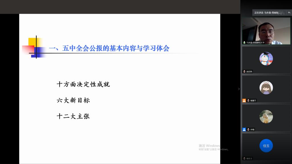 11月11日下午14:00,会计学院院长马永强在线上给同学们讲授了一堂生动的思政课,学院学生党建工作站、学生成长与发展中心学生干部参加了本次思政课,本次课程的主题为十九届五中全会学习体会和心得分享。