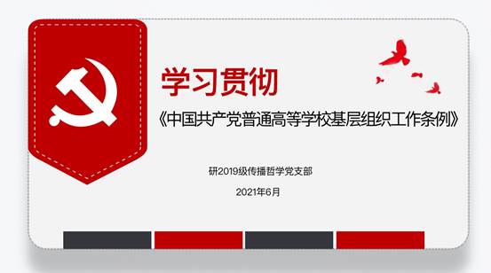 6月3日晚,人文学院2019级硕士传播哲学党支部召开线上主题教育会议,共同学习《中国共产党普通高等学校基层组织工作条例》、学校十四次党代会以来的建设与发展成就展等内容。会议由支部副书记冷宇主持开展。支部全体成员参加会议。