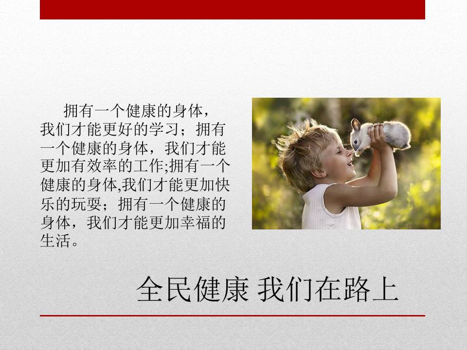 拥有一个健康的身体,我们才能更好的学习;拥有一个健康的身体,我们才能更加有效率的工作;拥有一个健康的身体,我们才能更加快乐的玩耍;拥有一个健康的身体,我们才能更加幸福的生活。