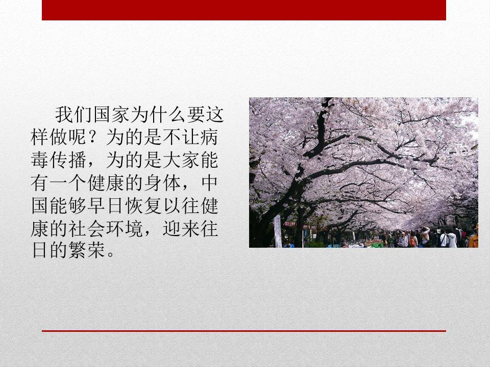 可是2019新型冠状病毒的发现打破了原有的一切,该病毒已确认存在人传人现象,且潜伏期具有传染性,所致疾病没有特异治疗方法,对人类的健康有着极大的威胁。面临着传播性如此大的病毒,我们开始了武汉封城、湖北封省、乃至全国的各个地区都施行了封闭管理,来控制病毒的传播。在春节期间,我们不能走亲访友,而是呆在自己的家里,几乎过着“与世隔绝”的生活。在接下来的日子里,我们一直进行着封闭的生活,日复一日,始终坚持着。因为我们坚信:病毒终究会被消灭,人类的健康终究会到来。