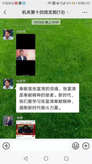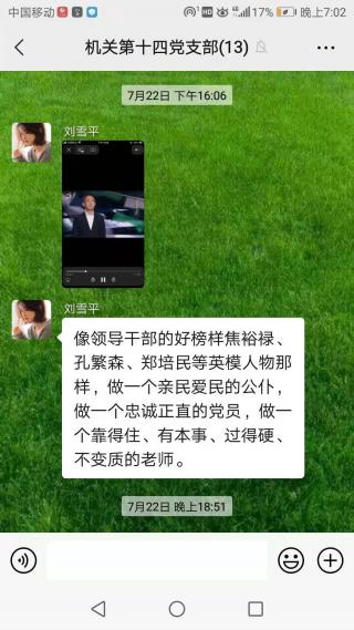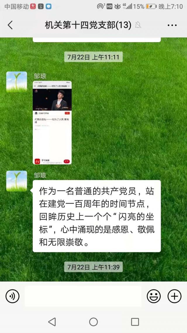 大家观看后通过微信方式进行了积极的讨论。支部书记周辉艳表示,英雄的故事荡气回肠,英雄的精神永放光芒。焦裕禄等革命英雄的一生是光荣伟大的一生,他们为了人民甘愿牺牲一切,他们是榜样是力量,是我们的人生坐标。我们要将有限的人生投入到无限的祖国发展建设之中,只争朝夕,不负韶华,以文化人,立德树人,努力为中华民族的伟大复兴贡献我们应有的力量。组织委员邹琼表示,作为一名普通的共产党员,站在建党一百周年的时间节点,回眸历史上一个个“闪亮的坐标”,心中涌现的是感恩、敬佩和无限崇敬之情。