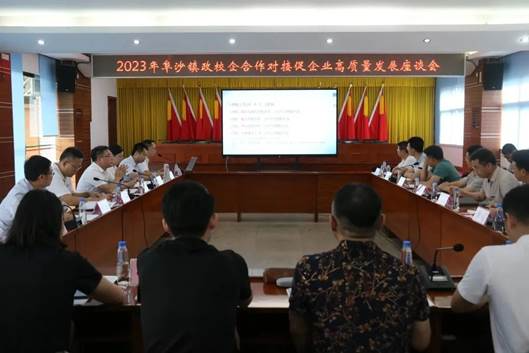 阜沙镇政校企合作对接促企业高质量发展座谈会上,阜沙镇副镇长李榕代表阜沙镇对高校代表的到来表示热烈欢迎,并介绍了阜沙镇基本情况、产业发展、人才引进及高校毕业生就业创业政策情况。阜沙镇党委书记张峻峰对阜沙镇经济社会发展情况进行了详细介绍,全面解构阜沙镇制造业发展以及六大产业情况,并表示希望以此次活动为契机,搭建政府、学校、企业交流桥梁,为进一步深化政校企合作,实现阜沙镇高质量发展提供坚强的人才支撑和技术支持。