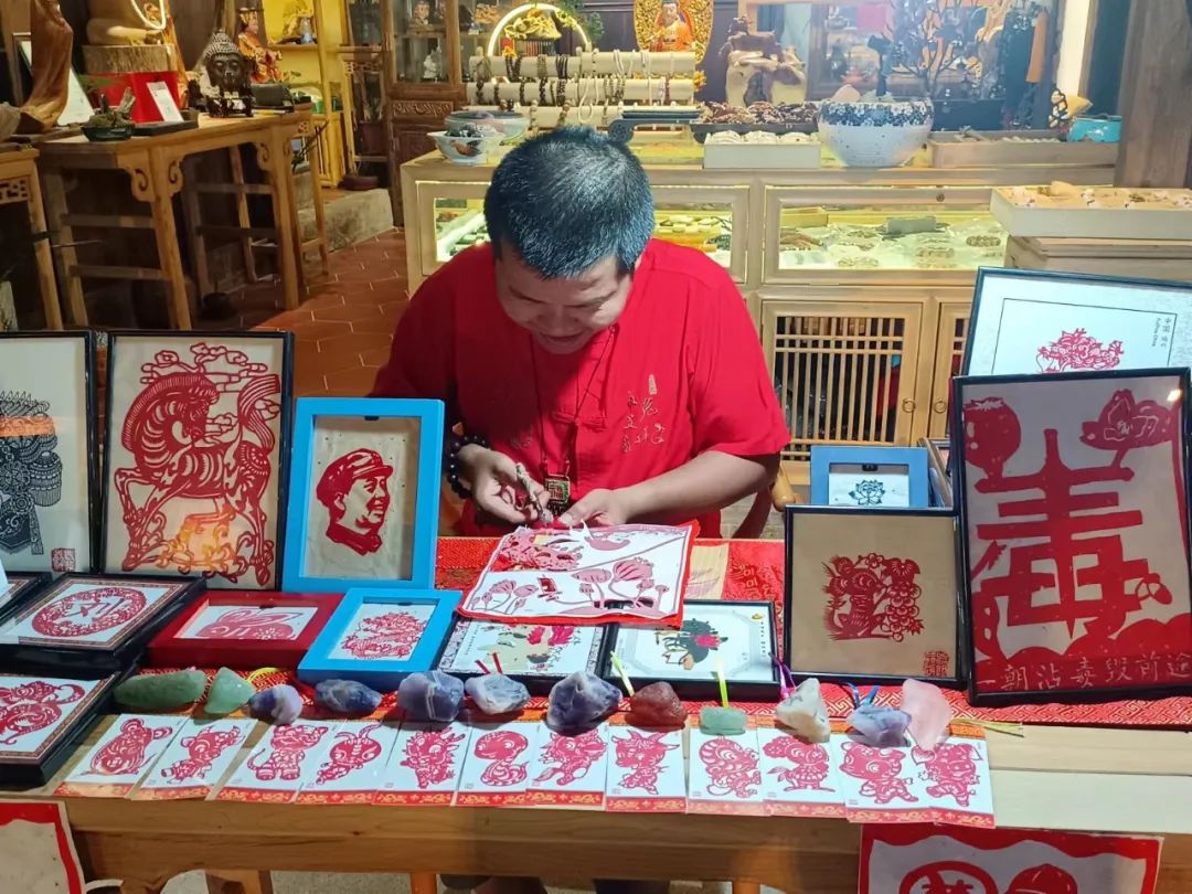 剪纸的寓意和象征非常丰富多样。剪纸的图案通常以吉祥语、民间谚语、神话故事为题材,将图案和吉祥语完美结合,凝结着人们的美好愿望,不同的剪纸寓意不同。图中的这个剪纸人是老翁,他因为很喜欢剪纸,所以在大学毕业之后从事该方面工作。他借助自己的手艺剪出了林则徐等为禁毒方面做出巨大贡献的人,不仅让我们熟知了禁毒历史,也让我们明白热爱也可以成为一份事业,这也是我们”三下乡“的必修课。
