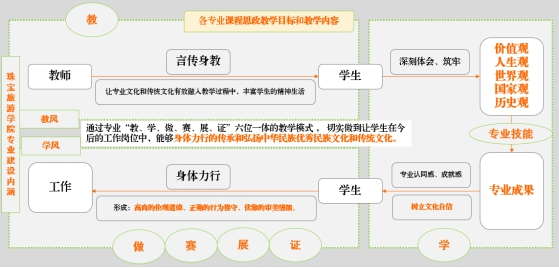 专业课程群教学模式为:①教,即感受美的原理:教师通过“言传身教”的方式,将首饰文化、传统优秀文化和美学知识,自然的融入课程教学中,丰富学生的精神生活。②学,即创造美的方法:学生通过对珠宝材料鉴别、首饰文化的学习、理解和内化,对美的形式进行感知、探究和共情的学习,深刻体会首饰的文化内化和形式美的高级形态,筑牢正确的人生观、价值观、世界观、国家观、历史观;③做,即创造美的态度和标准:在教师的辅导下,学生通过专业设计实践和工艺实践,感受首饰中“精工细做、精益求精”的工匠精神和设计文化,具备创造美的态度,达到创造美的标准。④赛、展,即享受美、传播美的自我升华:通过专业比赛和展业的成果分享方式,让同学们看到自己三年的辛勤付出是值得的,自己可以通过作品“身体力行”的让观众享受美,在众人中传播美。培养学生的专业认同感和自豪感,增强学生的人文修养和道德修养。⑤证,即规范教、学、做,达到高水平专业标准:通过国际认证、行业认证的引入,对各项认证标准进行分析,建立高水平的教、学、做、赛、展各项教学环节的教学规范和标准。确保这些教学环节达到高水平教学目标,做到与行业、企业、专业(继续深造)无缝对接,并最终确保学生形成:高尚的伦理道德、正确的行为操守、优雅的审美情趣。(详见下图1.)