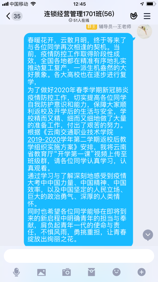 当前,疫情防控工作取得阶段性成效,全国各地都在精准有序地扎实推动复工复产,一派生机盎然的大好景象。各高校也在逐步进行复学,我院为迎接新学期的到来,保障学生顺利返校及开学后的生活与安全,精而又精、细而又细地做了大量的工作,付出了艰苦的努力。根据《云南交通职业技术学院2019-2020学年第二学期返校后教学组织实施方案》安排,体育部党支部书记和文雄同志悉心指导工作,承担毕业班班主任的三位党员教师也积极行动起来,以线上班会的方式为毕业班的同学认真开展了“开学第一课”的网络主题班会,旨在帮助即将开学的同学和家长科学、正确地认识新型冠状病毒,学会有效预防控制病毒感染,保持身心健康并调整好心态,尽快适应校园学习生活。