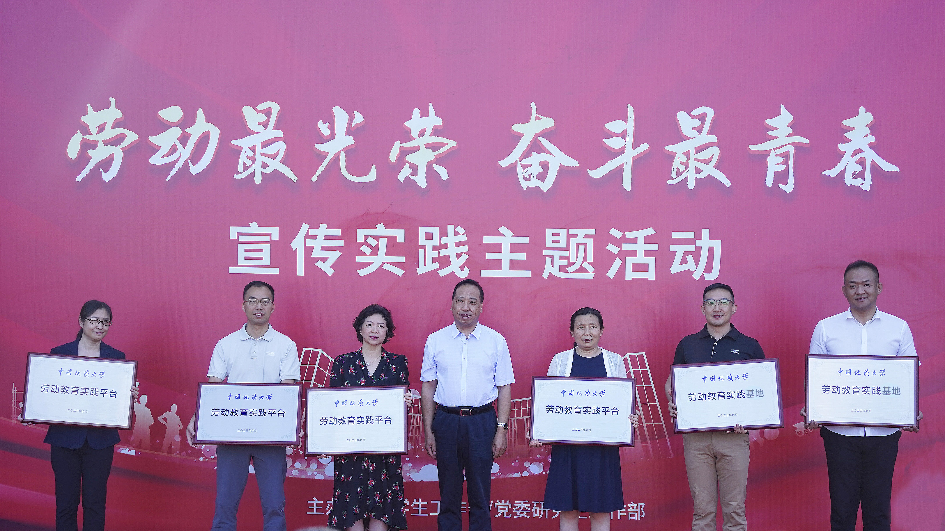 启动仪式上,赵志丹为中国地质图书馆、地大第一社区居民委员会2个劳动教育实践基地和体育部、图书服务中心、档案馆、体育馆4个劳动教育实践平台授牌。