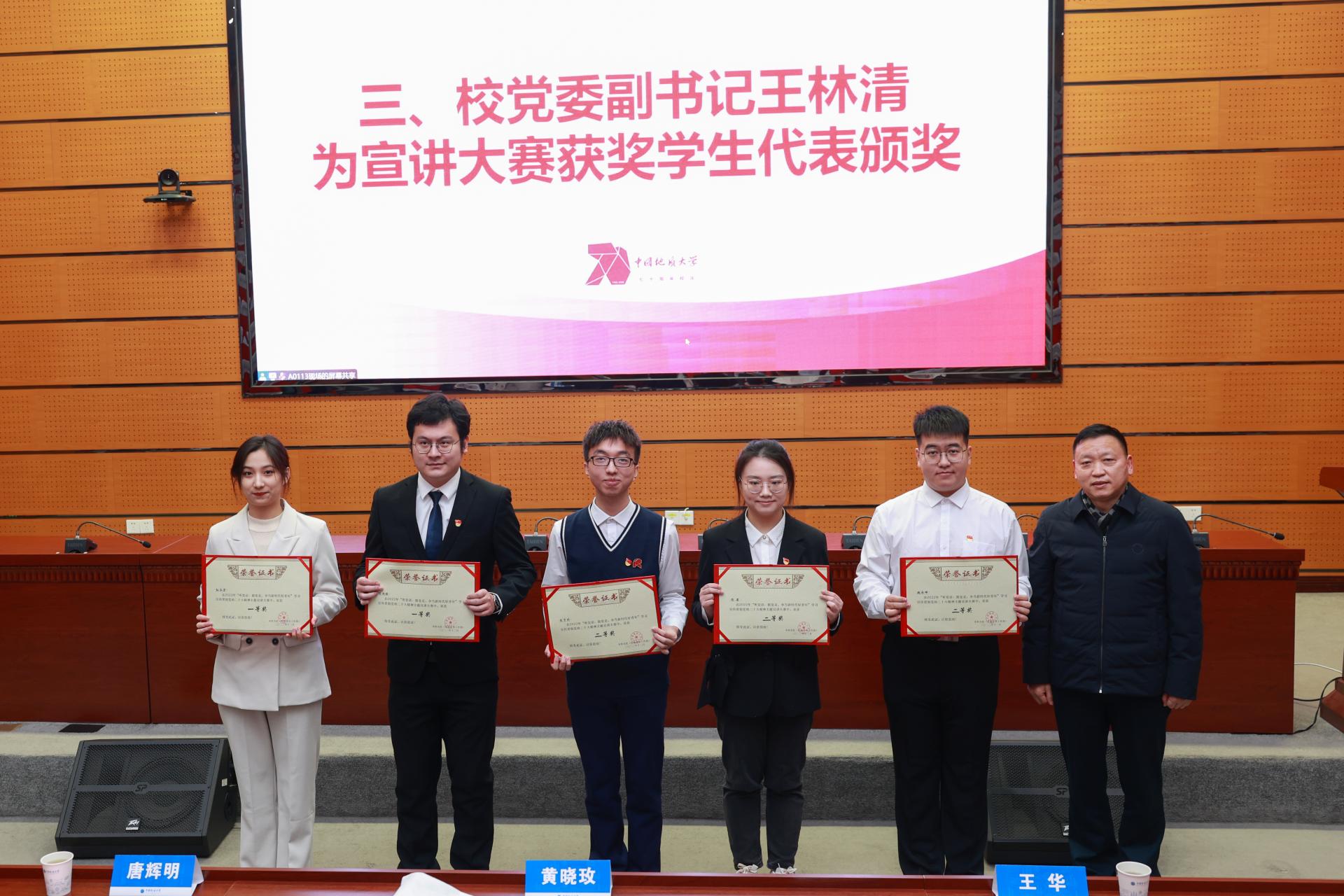 为加强师生理论武装,用青年话语更好宣传党的创新理论和路线方针政策,本科生院(党委学生工作部)在宣讲大赛决赛现场成立“向阳宣讲团”。黄晓玫为“向阳宣讲团”授旗,首任团长徐天宜代表“向阳宣讲团”接过团旗。